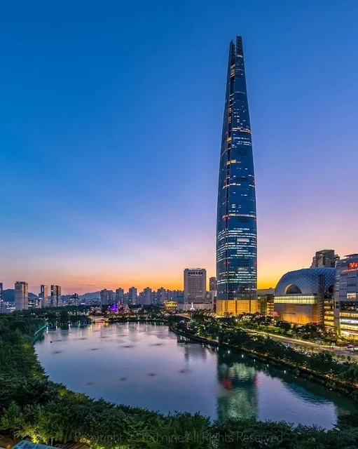 https://images.app.goo.gl/VmkE6Y8NofgKsJDXAThe Lotte World Tower's design is a testament to the integration of traditional Korean principles, including pungsu, into a modern architectural canvas. Drawing inspiration from the historic Korean arts of ceramics, porcelain, and calligraphy, the tower's sleek and uninterrupted curvature and gently tapered form are reflective of these art forms and by extension symbolize the application of pungsu principles, which emphasize natural harmony and balance. Furthermore, the seam that runs from the top to the bottom of the structure gestures toward the old center of the city, which can be seen as a nod to pungsu principles that value the alignment and directionality in relation to the natural and historical features of the landscape. Additionally, its elegance and form take into consideration the tower's environmental impact, achieving LEED Gold certification, and include sustainable design strategies such as photovoltaic panels and water harvesting systems, aligning with pungsu's focus on living in harmony with the environment